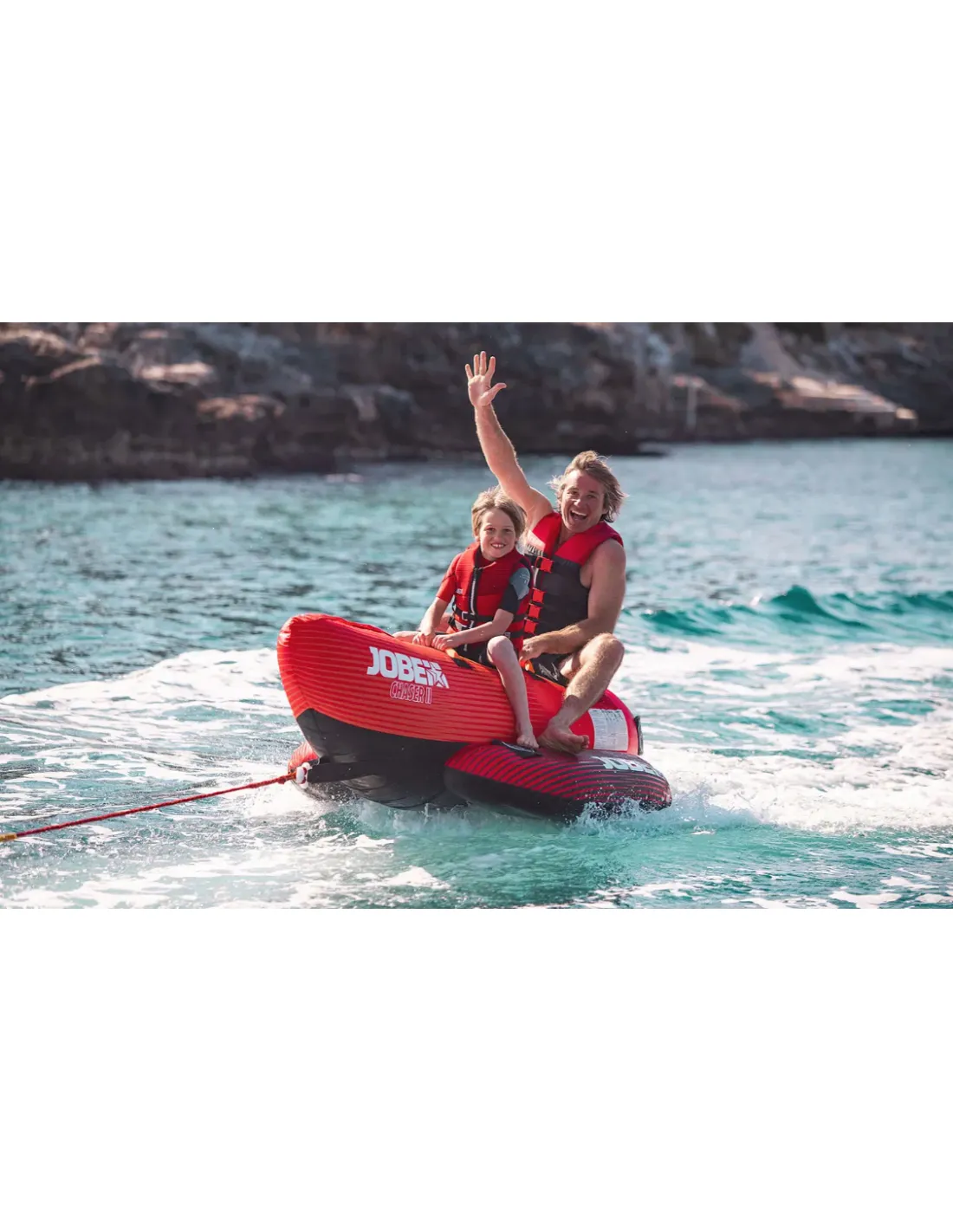 Atrévete y sube al Chaser de Jobe para 3 personas y pasa el mejor rato de tu vida. En este remolcador podrás montar con amigos o familiares. Su resistente cubierta de nylon 840 con doble costura protege la base de PVC de calibre 28 y el tubo para que no se dañen.