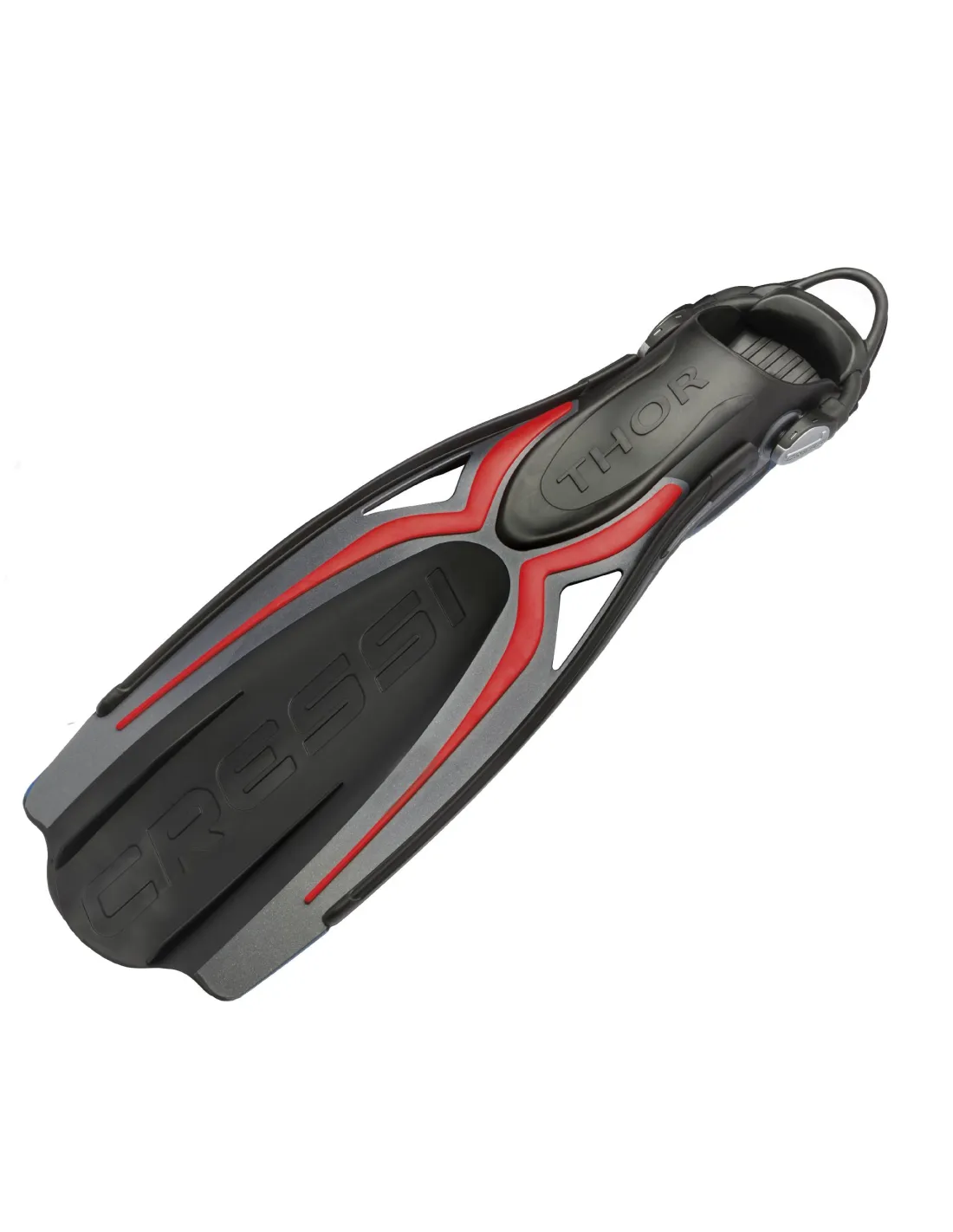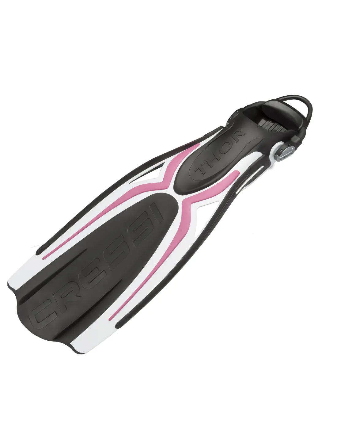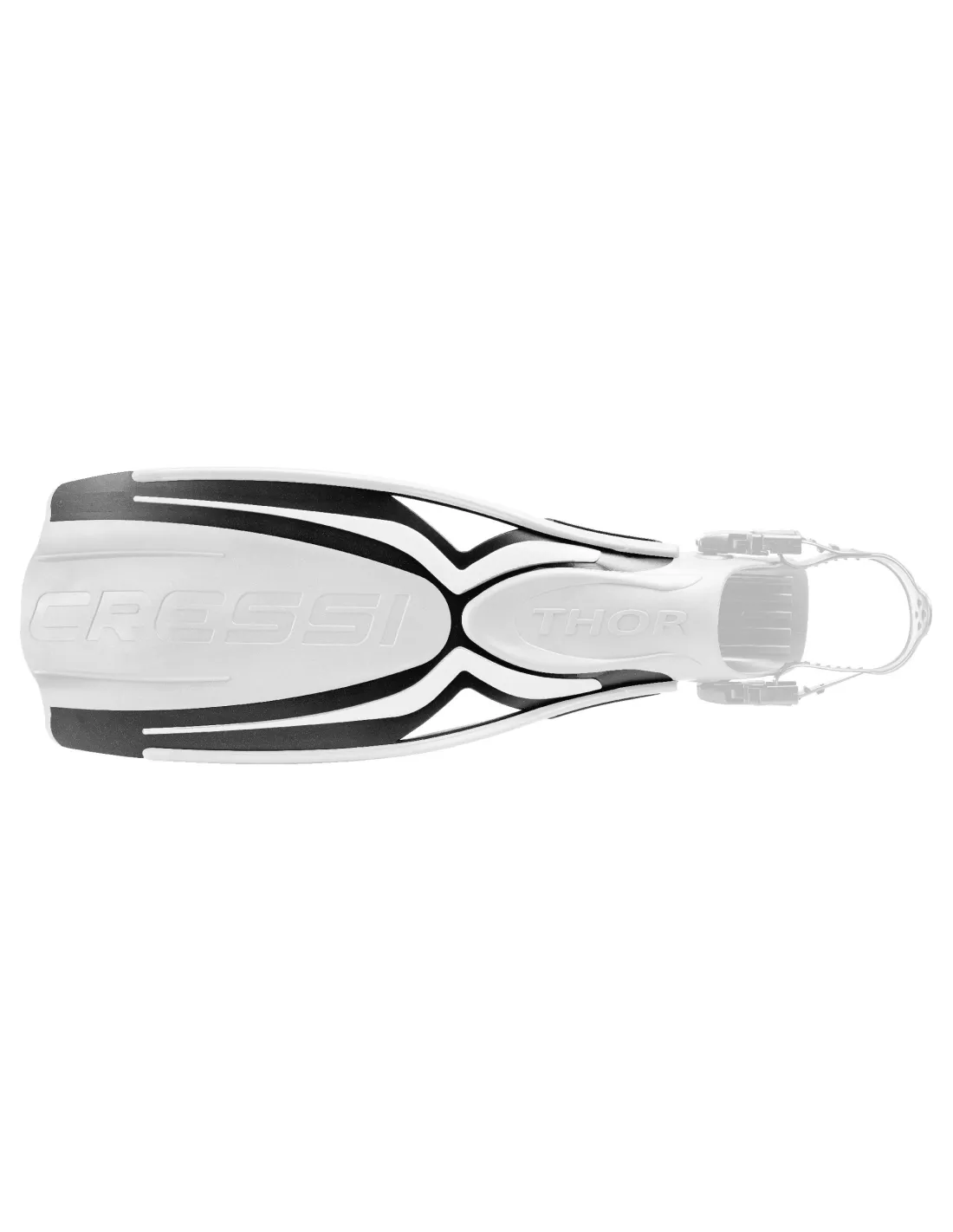 Descubra a inovadora barbatana CRESSI THOR EBS, concebida para proporcionar um desempenho superior em cada mergulho. A sua estrutura combina duas nervuras centrais de polipropileno de alta resistência e uma secção de borracha termoplástica convexa no centro da lâmina, maximizando a transmissão de energia e reduzindo o esforço.